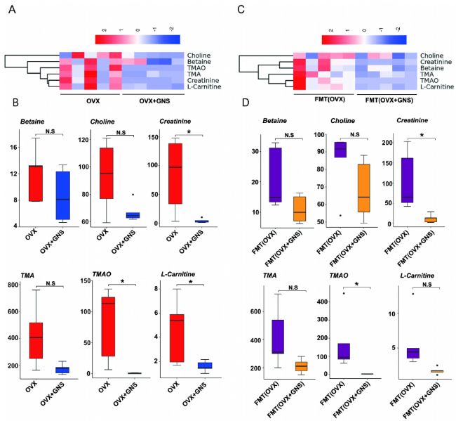 為了確定TMAO水平的變化是否與GNS治療誘導(dǎo)的腸道菌群改變密切相關(guān),我們在FMT組之間進(jìn)行了針對性的TMAO定量分析。OPLS-DA和PCA分析結(jié)果表明兩組之間明顯分離。FMT(OVX+GNS)中TMAO相關(guān)代謝物的產(chǎn)生也顯著低于FMT(OVX)組(圖7 C)。FMT(OVX+GNS)組的肌酸酐和氧化三甲胺濃度顯著低于FMT(OVX)組。總之,GNS給藥通過調(diào)節(jié)腸道微生物群的多樣性來降低代謝產(chǎn)物TMAO的豐度。