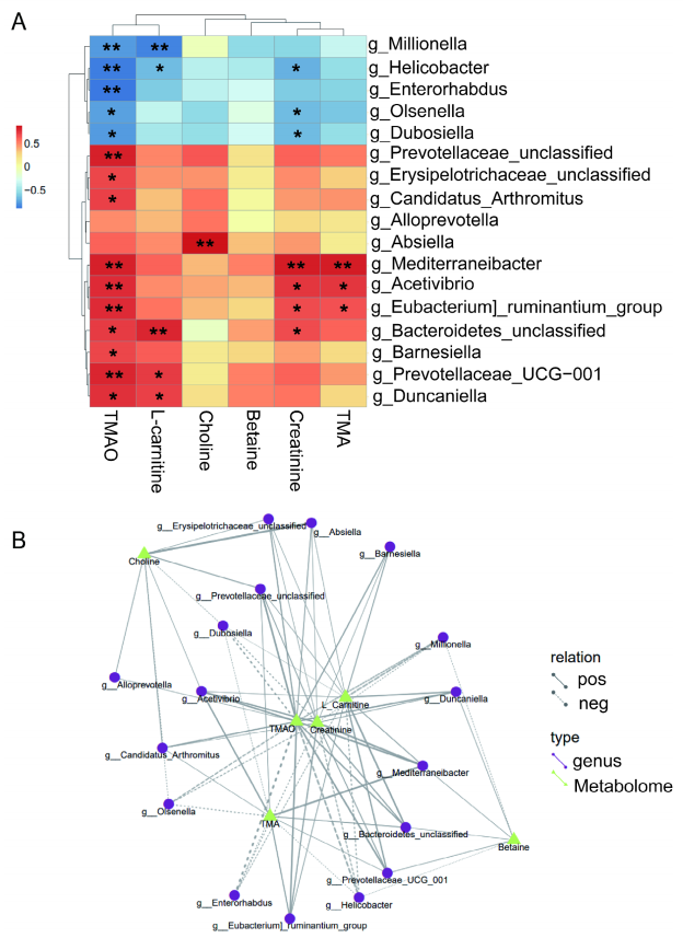 為了更好地確定腸道微生物群和代謝產(chǎn)物TMAO之間的聯(lián)系,作者進(jìn)行了腸道微生物組和代謝組的聯(lián)合分析。如關(guān)聯(lián)分析熱圖所示,17個(gè)屬與TMAO相關(guān)代謝產(chǎn)物具有顯著相關(guān)性,其中12個(gè)屬與TMAO相關(guān)代謝產(chǎn)物呈正相關(guān),5個(gè)屬呈負(fù)相關(guān)。接著為了進(jìn)一步展示腸道微生物菌與TMAO相關(guān)代謝產(chǎn)物之間的相關(guān)性,作者根據(jù)17個(gè)屬和TMAO代謝產(chǎn)物構(gòu)建了一個(gè)關(guān)聯(lián)網(wǎng)絡(luò)圖(圖8 B)。總之,這些結(jié)果提供了腸道微生物群和TMAO代謝產(chǎn)物之間的關(guān)系,這有助于進(jìn)一步的體外研究。