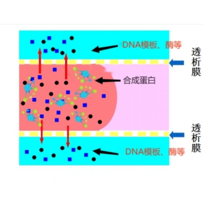無細胞蛋白表達:常規的無細胞蛋白表達反應,模板DNA、細胞提取液和其他組分混合放入透析管內,并放入特定成分的緩沖液。緩沖液中小分子包括氨基酸、核苷酸、ATP與其他因子會與透析管內的成分進行交換,持續提高反應物濃度,促進和提高蛋白質產量。Scienova透析管透析效率顯著減少相關實驗全程所需時間;惰性材質及密封保證反應科學性。