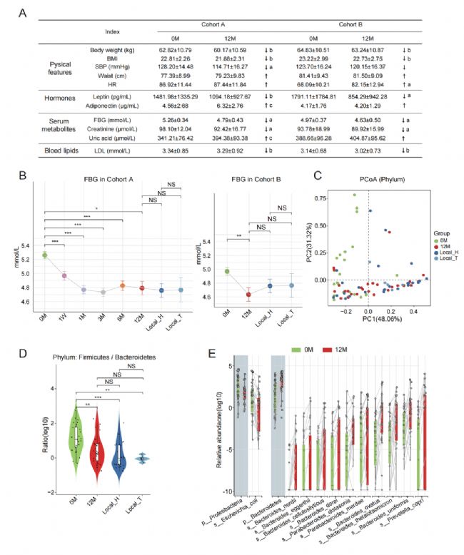 為進(jìn)一步了解腸道菌群的厭氧發(fā)酵能力,通過(guò)基因注釋獲得GMMs (Gut Metabolic Modules),與入藏前相比,入藏后12個(gè)月的腸道菌群的14個(gè)MFs增強(qiáng),11個(gè)MFs減弱,其中參與丙酸合成代謝的MF0084(Succinate conversion to propionate)、MF0093(Propionate production I)、MF0094(Propionate production II)和MF0080(Lactate consumption II)在12M組中減弱,據(jù)報(bào)道丙酸的增加與T2DM風(fēng)險(xiǎn)增加相關(guān),上述表明入藏后腸道菌群的丙酸合成能力降低。該推測(cè)通過(guò)對(duì)兩個(gè)隊(duì)列的血清丙酸進(jìn)行靶向檢測(cè)得到驗(yàn)證,且12M組的丙酸含量開(kāi)始與林芝地區(qū)居住5年以上的個(gè)體變得相近(圖3 A、B)。