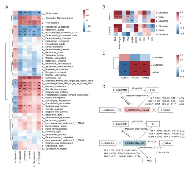 那么L-纈氨酸、L-谷氨酸和L-谷氨酰胺是否可以解釋或介導(dǎo)腸道菌群(即B. ovatus, E. coli)對(duì)臨床指標(biāo)(即FBG、BMI、BW)的影響?通過(guò)中介分析發(fā)現(xiàn)L-谷氨酸能介導(dǎo)B. ovatus 和FBG間的負(fù)作用,而L-谷氨酸和L-纈氨酸能介導(dǎo)E. coli和FBG間的正作用(圖5 D);此外,L-谷氨酸和L-纈氨酸還能介導(dǎo)B. ovatus與BMI和BW間的負(fù)作用,E. coli與BMI和BW間的正作用(圖5 D)。但L-谷氨酰胺對(duì)B. ovatus和E. coli與臨床指標(biāo)(即FBG、BMI、BW)沒(méi)有顯著的中介作用。由此可知,L-纈氨酸和L-谷氨酸在中等海拔暴露個(gè)體中可能介導(dǎo)了B .ovatus和E. coli對(duì)臨床指標(biāo)(即FBG、BMI、BW)的影響。