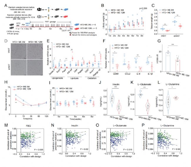 為進(jìn)一步研究中等海拔暴露個(gè)體的腸道菌群對(duì)AAs和FBG的影響,隨機(jī)選擇6名入藏前、6名入藏后12個(gè)月的志愿者的糞便,制成勻漿灌胃給HFD C57BL-6J小鼠(圖6 A),分為對(duì)照組小鼠(HFD + ME 0M組)和干預(yù)組小鼠(HFD + ME 12M組)。研究發(fā)現(xiàn)兩組間的飲食攝入量不受菌群移植操作的影響。(HFD + ME 12M)組小鼠體重增長(zhǎng)率降低(圖6 B),脂肪組織重量降低(圖6 C)。白色脂肪組織的組織切片顯示,(HFD+ME 12M)組的脂肪細(xì)胞直徑明顯小于(HFD+ME 0M)組(圖6 D);(HFD+ME 12M)組的白色脂肪組織中參與脂肪生成的基因(包括Srebf1、Scd1和Fasn)顯著較低,而參與脂肪分解和脂肪酸氧化的基因(包括Adrb3、Pnpla2、Acox1和Ppargc1a)升高(圖6 E)。此外,炎癥因子(Cd68、Ccl2、IL-6和IL-1β)在(HFD+ME 12M)組的脂肪組織中表達(dá)減弱,表明炎癥狀態(tài)有所改善(圖6 F)。口服葡萄糖耐量實(shí)驗(yàn)(Oral Glucose Tolerance Test, OGTT)顯示(HFD + ME 12M)組中在改善葡萄糖不耐受方面沒(méi)有好的效果。盡管通過(guò)胰島素耐量試驗(yàn)(Insulin Tolerance Test, ITT)的葡萄糖濃度曲線下面積(Area Under the glucose concentration Curve, AUC)顯示胰島素敏感性無(wú)顯著性改變,但胰島素抵抗指標(biāo)(Homeostasis Model assessment of Insulin Resistance,HOMR-IR)在(HFD+ME 12M)組中降低。非常重要的是,在(HFD+ME 12M)組中,F(xiàn)BG水平在菌群移植后6周就出現(xiàn)顯著降低且胰島素水平顯著降低(圖6 I、J);但瘦素和脂聯(lián)素在兩組間無(wú)差異。AAs檢測(cè)結(jié)果顯示(HFD+ME 12M)組中的L-谷氨酸和L-天冬氨酸顯著降低,L-谷氨酰胺顯著升高(圖6K、L),而L-纈氨酸變化不顯著。16S rDNA擴(kuò)增子數(shù)據(jù)表明,菌群移植后小鼠的腸道菌群組成與供體的腸道菌群組成相似;在第8周時(shí),(HFD+ME 12M)組的Firmicutes/Bacteroidetes顯著低于(HFD+ME 0M)組,但兩組間Proteobacteria的相對(duì)豐度未發(fā)生顯著變化。此外,通過(guò)用微生物數(shù)據(jù)建立的OPLS回歸模型可以很好地預(yù)測(cè)受體小鼠的臨床指標(biāo)變化,尤其是FBG、胰島素、 L-谷氨酸和L-天冬氨酸水平,但不能預(yù)測(cè)L-谷氨酰胺水平(圖6 M-P),表明糞便捐獻(xiàn)者的腸道菌群組成能夠較好地預(yù)測(cè)出受試者的臨床指標(biāo)變化。FBG和HOMR-IR的減少表明腸道菌群在調(diào)節(jié)血糖穩(wěn)態(tài)代謝方面有重要的因果作用。