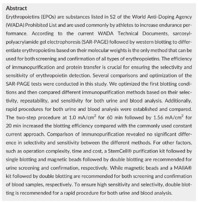 Comparison and optimization of SAR‐PAGE tests for erythropoietins in doping analysis【WILEY】