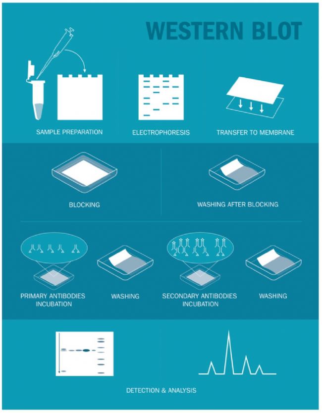 Western Blotting(WB)蛋白質免疫印跡雜交,是采用印跡技術將聚丙烯酰胺凝膠電泳分離后的蛋白質轉移到膜上,再根據抗原-抗體特異性反應,即一抗/二抗復合物特異性檢測復雜樣品中某種蛋白的方法(流程如圖1)。WB是最常用的蛋白質分析技術之一,廣泛應用于蛋白表達水平的檢測。