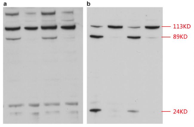 洗膜過程在4℃下進行,可以避免特異性抗體-抗原結合的過度解離,同時有效減少非特異性結合,提高結果質量。實驗者采用透明細胞腎癌(ccRCC)細胞系的細胞提取物與兔多克隆抗PARP抗體進行WB實驗。在完全一致的電泳轉膜后,將a膜進行手工封閉孵育和洗膜操作,一抗4℃下過夜孵育,其余步驟均在室溫下完成,b膜采用Blotcycler全程4℃下自動化處理,其結果如圖2所示:采用手工程序處理的印跡膜,結果檢測到多個非特異性條帶,見圖2a;而Blotcycler全程4℃下自動化處理的印跡膜,僅檢測到未切割的PARP蛋白(113kD)以及C端和N端切割的PARP片段(分別為89kD和24kD)的條帶,見圖2b(數據來自Precision Biosystems)。