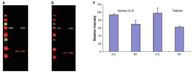圖3: a,所有步驟(封閉,孵育,洗膜)均在室溫下進行;b,所有步驟(封閉,孵育,洗膜)均在4度下進行;a和b中,泳道1為marker,泳道2為HeLa細胞的全細胞裂解液,泳道3為重組h-IL2,泳道4為HeLa細胞全細胞裂解液和重組h-IL2的混合樣本;c,用MW標準對兩張膜進行熒光強度歸一化處理后的結果;