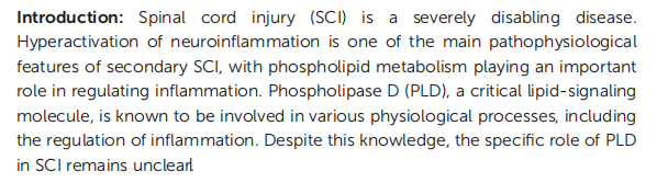 脊髓損傷(SCI)是一種嚴重的致殘性疾病,神經炎癥的過度活化是繼發性脊髓損傷的主要病理特征之一,其中磷脂代謝在炎癥調節中起關鍵作用。磷脂酶D (Phospholipase D, PLD)是一種重要的脂質信號分子,參與多種生理過程,包括炎癥調節,但是PLD在SCI中的具體作用機制仍不清楚。