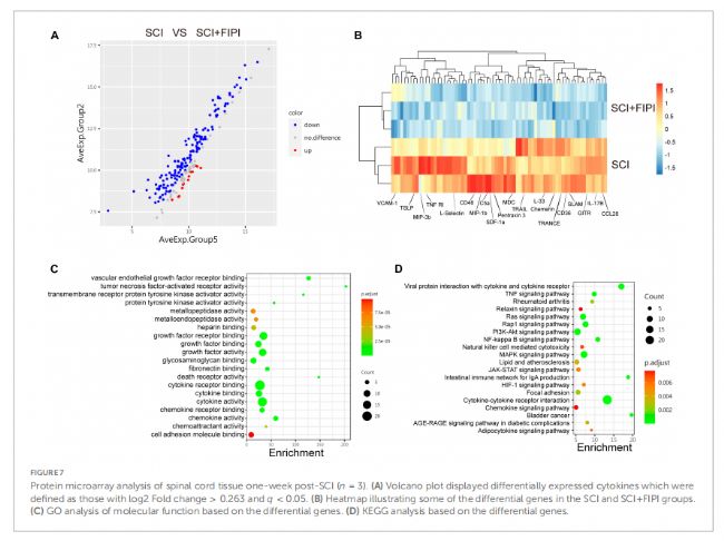 為了進一步研究PLD在SCI中的作用,研究人員使用細胞因子芯片對假手術組、脊髓損傷組和脊髓損傷7天并給與PLD抑制劑FIPI組進行分析,首先提取脊髓組織蛋白,并滴加到細胞因子微陣列芯片上,4℃ 孵育過夜,然后對載玻片進行清洗,隨后加入一抗室溫孵育2小時,再進行清洗,并加入Cy3 標記的鏈霉親和素在室溫下避光孵育1小時,清洗后使用法國Innopsys的InnoScan 300(新型號InnoScan 710)熒光掃描儀進行熒光信號分析,其中共檢測了200種不同的細胞因子表達水平。結果:SCI和SCI+FIPI組中有71種細胞因子表達存在差異,炎癥相關因子在SCI+FIPI組表達顯著下調,包括腫瘤壞死因子以及炎癥相關信號通路(TNF信號通路和NF-κB信號通路)。這表明FIPI在蛋白水平上對脊髓損傷具有一定的抗炎作用。