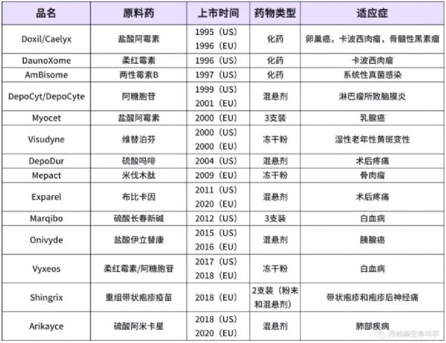正是由于脂質(zhì)體能夠?qū)⒍靖弊饔么、在血液中穩(wěn)定性差、降解快的藥物包裹,并將藥物濃集于病灶部位達(dá)到緩釋或靶向給藥的目的,正作為藥物載體被應(yīng)用于小分子藥物、蛋白質(zhì)藥物、核酸藥物和顯像劑等。目前,全球共有14個脂質(zhì)體產(chǎn)品獲批上市,分別是: