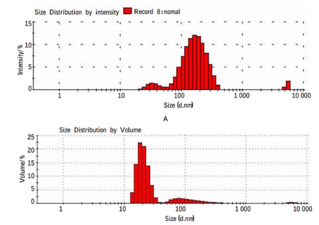 A:超聲前脂質體粒徑分布圖;B:超聲20min后脂質體粒徑分布圖,輸入功率40%;超聲時間20min;磷脂含量10mmol/L
