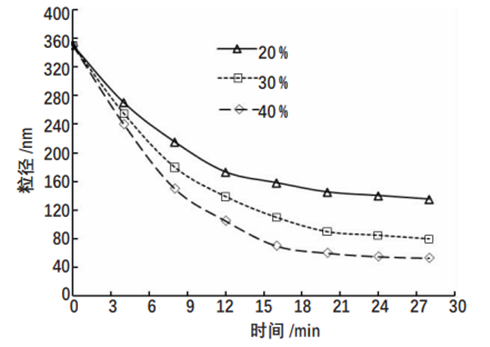 圖4 磷脂含量為10mmol/L,超聲功率分別為20%、30%和40%時粒徑及分散性隨超聲時間的變化