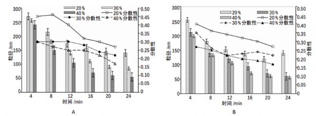 A:磷脂含量為10mmol/L,超聲功率分別為20%、30%和40%時粒徑及分散性隨超聲時間的變化(探頭深度10mm);B:磷脂含量為10mmol/L,超聲功率分別為20%、30%和40%時粒徑及分散性隨超聲時間的變化(探頭深度15mm)