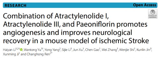 文章于2024年1月發表在《Chinese Medicine》雜志,作者來自首都醫科大學北京腦疾病研究所腦卒中研究中心。中醫理論認為治療缺血性中風應該從改善血瘀、氣虛和郁結入手,核心癥候包括瘀血證、痰證、陰虛、氣虛、肝亢等。 當代中醫研究確定了幾種具有神經保護作用的有效提取物,包括活性AMK成分白術內酯 I (Atr I)和白術內酯 III (Atr III)以及芍藥甙(Pae),已經顯示出比較好的藥理學作用,包括神經保護,抗炎,抗氧化,抗過敏和抗癌特性。本研究旨在探索Atr I,Atr III和Pae聯合使用是否可以促進中風后大腦血管的形成,從而改善缺血性中風神經功能的恢復。
