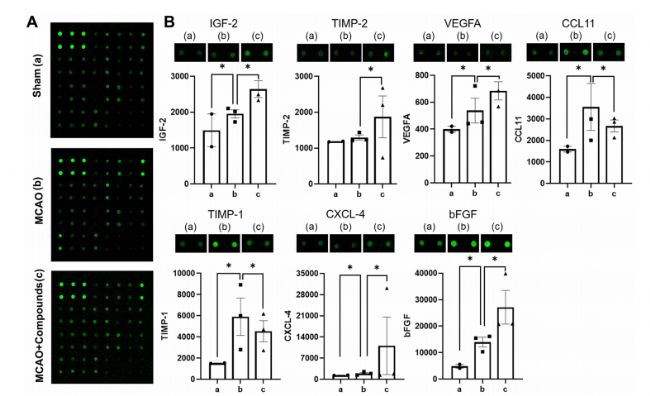 在文中,作者使用雄性C57BL/6小鼠的大腦動脈閉塞模型 (MCAO)造模,每天灌胃給藥(Atr I,Atr III和Pae),評估藥物對腦保護和血管生成的影響。細胞免疫熒光實驗發現中藥化合物可以促進細胞增殖,細胞劃痕實驗表明Atr I、Atr III和Pae聯合使用可促進細胞增殖和細胞遷移,并刺激延遲管形成。同時,活體體內實驗發現化合物可明顯減小小鼠腦部的梗死面積,并降低神經功能障礙。 隨后為了研究化合物促進血管生成的分子機制,通過血管生成抗體陣列并聯合法國Innopsys公司的生物芯片掃描儀InnoScan 300(現新型號InnoScan 710),比較MCAO模型組和MCAO模型組+化合物治療組的血管生成相關蛋白的表達水平,在23個靶蛋白中,發現有7個蛋白存在顯著的表達差異,具體見圖1。