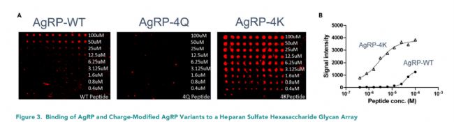 結果顯示:AgRP和電荷修飾AgRP變體與硫酸肝素聚糖陣列相結合;AgRP的結合親和力與巰基化狀態和硫酸肝素寡糖的長度有關,6S和NS磺化對AgRP的結合有利,而3S磺化對AgRP的結合不利,AgRP-4K突變型的結合能力是野生型的50倍,如下圖。