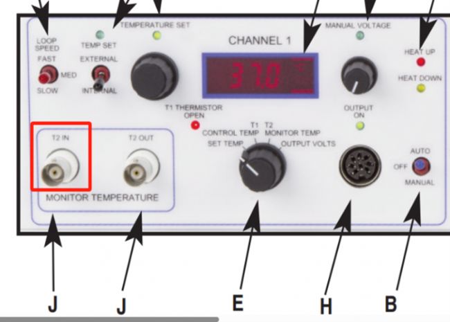 首先,把TA-29溫度反饋探頭放入到浴液中,并且BNC端連接在溫控主機的T2 IN口上,如下圖所示: