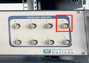 接下來我們需要把溫控主機與數模轉換器連接,需要一個足夠長的BNC線連接T2 OUT口和ANALOG INPUTS閑置的接口(圖中以3號口為例)。