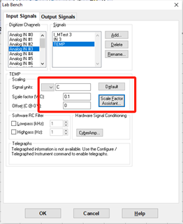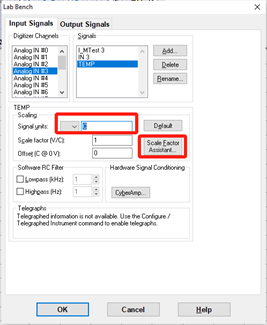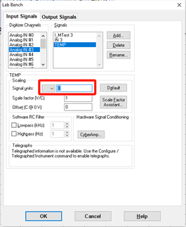 T2 OUT 口會把當前熱敏探頭采集到的溫度以電壓信號的方式發出來,電壓與溫度的比例系數為100mv/℃。(例:當前采集到的實時溫度是10攝氏度,則輸出1000mv電壓)數模轉換器可將接收到的電壓信號轉換為想要的溫度信號,所以在此之前需要將數模的ANALOG INPUT 3口的比例系數進行編輯,從而采集到準確的溫度信息。