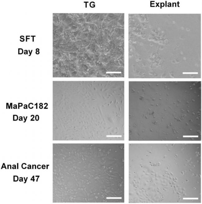 圖 1. 采用組織研磨器(TG)和外植體法處理的三種不同腫瘤組織之間的對比。展示了肉瘤、胰腺癌以及肛管癌腫瘤樣本分別經組織研磨器和外植體法處理后,在處理后的第 8 天、第 20 天和第 47 天的明場圖像。這些圖像是使用 4 倍蔡司物鏡(編號為 LDA-Plan421231-991)拍攝的。白色標尺代表 200 微米。