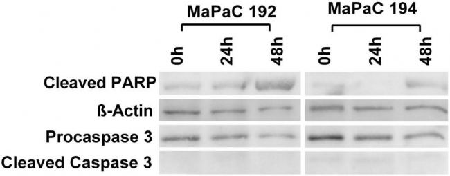 圖 2. 細胞在組織研磨器 (TG) 處理過程中所承受的機械應力并不會導致細胞凋亡。對取自兩名不同供體(編號分別為MaPac192和MaPaC194)的胰腺癌組織樣本經組織研磨器處理后所獲得細胞中分離出的總蛋白進行了蛋白質免疫印跡分析。在組織處理后即刻、24 小時以及 48 小時收集細胞,對聚 ADP 核糖聚合酶(裂解型聚 ADP 核糖聚合酶)、半胱天冬酶 3 以及裂解型半胱天冬酶 3 的表達情況進行了研究。每條泳道上樣 20 微克總蛋白,并通過 β- 肌動蛋白來確認蛋白上樣量相等。