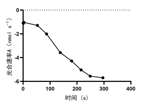 圖4 光強從100改變至0 umol m-2 s-1時,云杉上層葉片光合速率隨時間的變化曲線