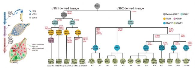 研究團隊通過解析人類DRG中感覺神經(jīng)發(fā)生和神經(jīng)元特化過程,發(fā)現(xiàn)嚴格的細胞發(fā)生順序是建立DRG復雜細胞類型的重要因素之一。感覺神經(jīng)元在不同的發(fā)育階段和譜系中的命運,是由外部信號和內部轉錄因子的協(xié)同作用共同決定。