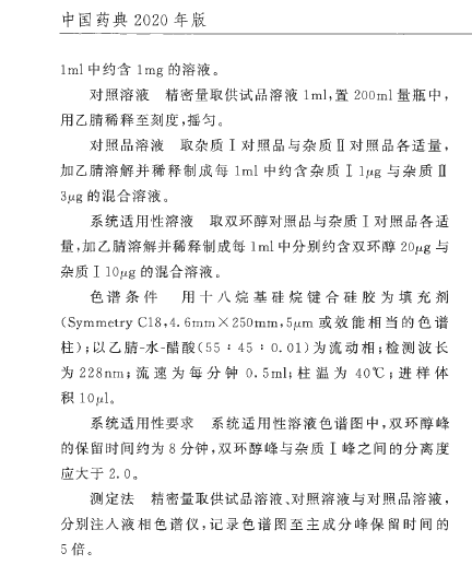雙環醇為一冊圖集中4號品種,在雙環醇與雙環醇片國家藥品標準草案公示稿中,色譜條件中刪除了推薦色譜柱,系統適用性要求中增加了雜質I和雜質II的分離要求。