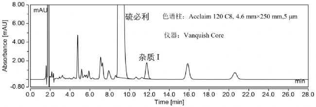 賽默飛使用Vanquish Core儀器和Acclaim C18色譜柱可以得到完全滿足公示稿要求的系統適用性溶液譜圖: