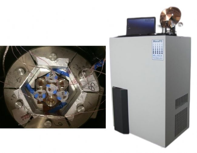 使用 0.22μm 過濾器過濾二元模型溶液水 + 氯化鈉(溶質(zhì)質(zhì)量分?jǐn)?shù)為 5% 和 15%)和水 + 泊洛沙姆(溶質(zhì)質(zhì)量分?jǐn)?shù)為 5% 和 10%),將其裝入玻璃樣品瓶,并放置在米爾羅克科技公司 MicroFD 凍干機(jī)(如下圖所示)的 HFT 上方。在不同測試中分別使用 1 個或 7 個樣品瓶;下圖展示了使用 7 個樣品瓶的實(shí)驗(yàn)裝置照片。在冷凍 / 解凍循環(huán)過程中,通過熱電偶監(jiān)測產(chǎn)品溫度。HFT 實(shí)驗(yàn)采用受控冰核形成方法。共進(jìn)行了 13 次實(shí)驗(yàn)。