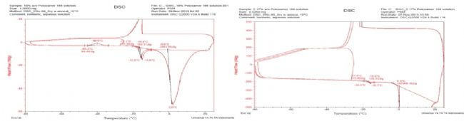 圖 1. 質(zhì)量分?jǐn)?shù) 10%(左)和 0.17%(右)泊洛沙姆溶液的 DSC 冷卻 / 加熱曲線。在質(zhì)量分?jǐn)?shù) 10% 的溶液升溫過程中,于 - 45℃至 - 35℃之間觀察到溶質(zhì) + 水結(jié)晶現(xiàn)象。在質(zhì)量分?jǐn)?shù) 0.63%(未展示)和 0.17% 的溶液中,無論是冷卻還是升溫過程中均未檢測到結(jié)晶事件。