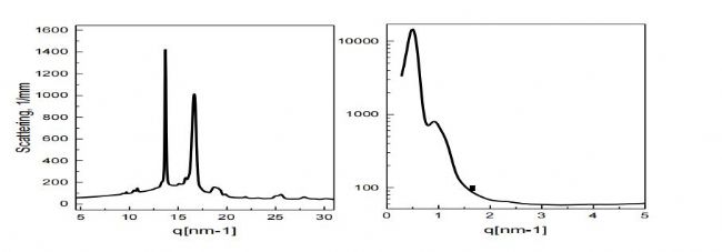 圖 2a. 室溫下 P188 的 SAXS(右)和 WAXS(左)圖譜。SAXS 圖譜中峰位置的比值為 1.82,接近六方相的特征比值 1.73。
