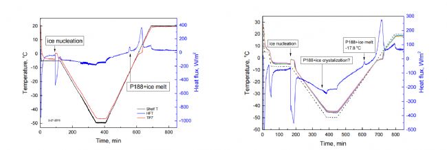圖 5. 10%(左)和 5%(右)P188 溶液冷卻 / 加熱循環(huán)的溫度和 HFT 數(shù)據(jù)。兩種情況下在升溫過程中均檢測到 P188 + 冰的融化,HFT 測得的溫度與 DSC 和 XRD 測量結(jié)果一致。然而,HFT 未檢測到二次結(jié)晶。