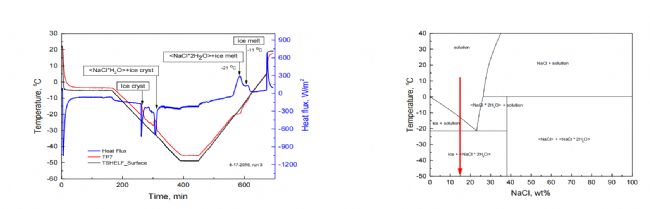圖 3. 15% 氯化鈉溶液冷卻 / 加熱循環(huán)的溫度和 HFT 數(shù)據(jù)(左)以及氯化鈉 - 水體系的相圖(右)。冷卻過程:HFT 檢測到初級冰形成和二次 NaCl・2H₂O + 水結(jié)晶。升溫過程:HFT 檢測到共晶熔化和冰融化。升溫過程中 HFT 測得的轉(zhuǎn)變溫度(Te = - 21℃,TL = - 11℃)與相圖中的溫度(Te = - 21.4℃,TL = - 13.1℃)接近。
