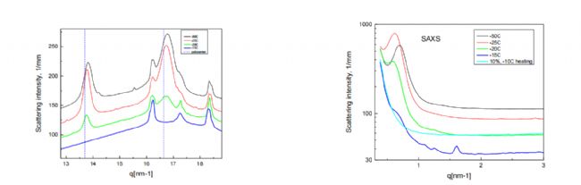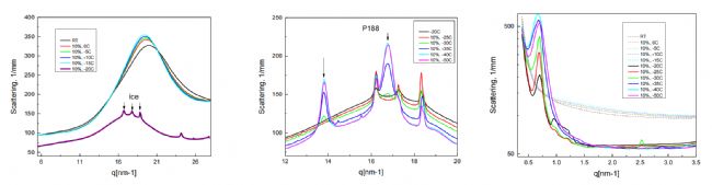 圖 2b. 質(zhì)量分?jǐn)?shù) 10% 泊洛沙姆溶液冷卻過程中獲得的低溫同步加速器 SAXS 和 WAXS 圖譜。在 - 15℃至 - 20℃之間觀察到冰的形成(WAXS 圖譜,左圖),而 P188 的結(jié)晶峰(三維結(jié)構(gòu))在較低溫度 - 25℃至 - 30℃之間出現(xiàn)(WAXS 圖譜,中圖)。SAXS 在與冰形成相同的溫度范圍( - 15℃至 - 20℃,右圖),即三維結(jié)構(gòu)形成之前,檢測到長程結(jié)構(gòu)的發(fā)展。請注意,純的 “原樣” P188 具有六方結(jié)構(gòu),而冷凍溶液對應(yīng)立方結(jié)構(gòu)。