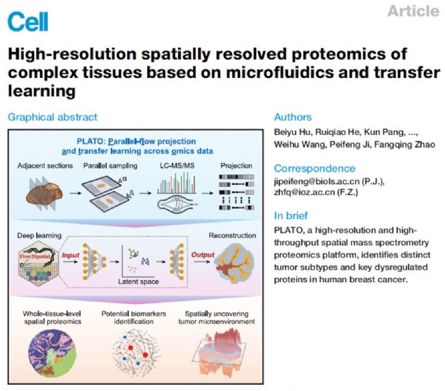 2025年2月,中國科學院動物研究所趙方慶團隊聯合國家蛋白質科學中心(北京)王貴賓在Cell雜志上發表了題為“High-resolution spatially resolved proteomics of complex tissues based on microfluidics and transfer learning”的研究論文[2],該研究整合微流控技術、微量蛋白質組學檢測技術和人工智能深度學習算法,開發出一種全新的高分辨率和高通量空間質譜蛋白質組學平臺PLATO,能夠實現對整個組織切片中數千種蛋白質的精確映射。
