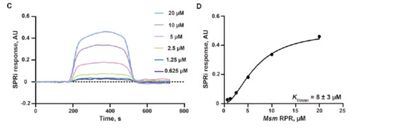 (C) 用于測定M1syn與Msm RPR結合親和力的代表性表面等離子體共振成像(SPRI)傳感圖。將濃度遞增的Msm RPR(0.625–20 μM)流過M1syn固定的芯片,獲得SPRI傳感圖和相應的結合曲線(D)三次獨立試驗的數據用于計算報告的結合親和力(K_D(app))值的平均值和標準偏差。