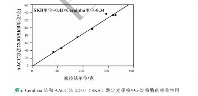 圖 5. Ceralpha 法和 AACC 法 22-01(SKB)測(cè)定麥芽粉中α-淀粉酶的相關(guān)性用兩種方法對(duì) 7 份麥芽樣品進(jìn)行重復(fù)分析。