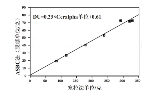 在 Campden-Chorleywood 食品研究協(xié)會(huì)協(xié)調(diào)的 Farrand 法和 Ceralpha 法的實(shí)驗(yàn)室間比較中,小麥面粉α-淀粉酶的 Farrand 單位與 Ceralpha 單位的相關(guān)性為: