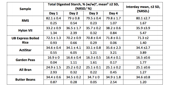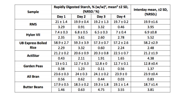 表1.使用DSTRS測定程序在四天內對樣品進行兩次快速消化淀粉測量的重復性(%RSDr)。