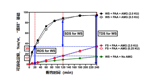 文獻表明,食物在人體小腸中的平均停留時間為4±1小時。因此,這被選為RINTDF程序中PAA/AMG的孵育時間。在Englyst等人1的可消化碳水化合物程序中,在20分鐘時取出樣品以測定快速消化淀粉(RDS),在120分鐘時取出緩慢消化淀粉(SDS),剩余的淀粉被定義為抗性淀粉(RS)。由于食物在小腸中的停留時間約為4小時,因此RS應定義為在這段時間內孵化后剩余的淀粉。我們現在引入一個新術語“總可消化淀粉(TDS)”來表示在4小時培養過程中水解的淀粉。因此,在當前的測定方案中,在4小時時從培養混合物中取出額外的樣品以測量TDS。