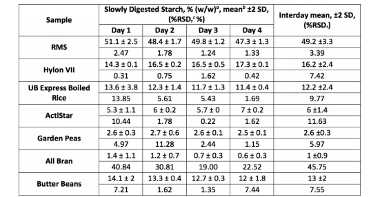 表2.使用DSTRS測定程序在四天內對七個研磨樣品進行兩次緩慢消化淀粉測量的重復性(%RSDr)分析。