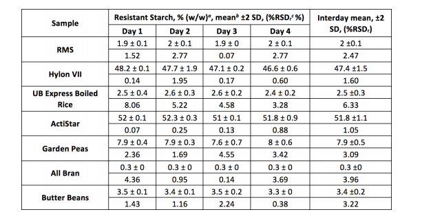 表4.使用DSTRS測定程序在四天內對七個研磨樣品進行兩次抗性淀粉測量的重復性(%RSDr)分析。