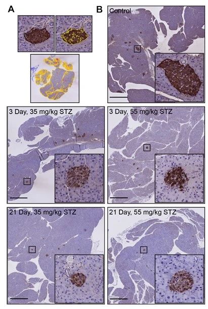 圖 1 免疫組化標記胰島素,蘇木精反染后的胰腺組織病理學觀察(B)[1]