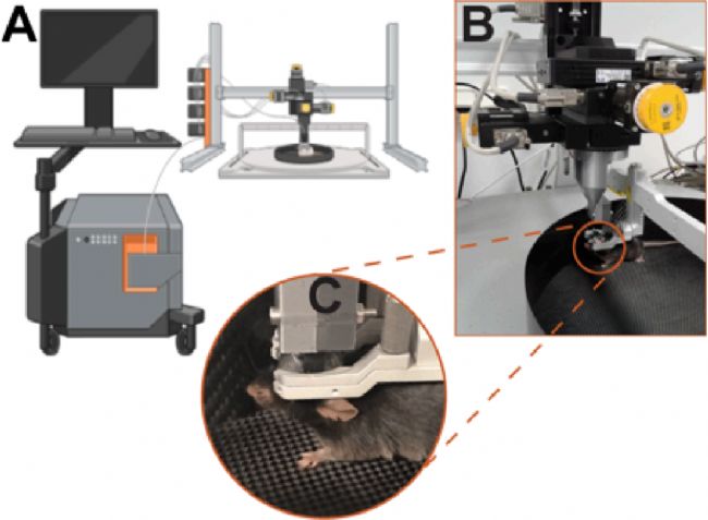為了研究阿片類藥物對(duì)大腦功能的影響,作者利用fUS在清醒未處理顱骨小鼠上進(jìn)行腦功能成像,這一工作在ICONEUS fUS成像系統(tǒng)和氣浮籠上完成,后者為頭部固定的小鼠提供易于適應(yīng)的活動(dòng)空間和穩(wěn)定的成像效果,最大程度地保證清醒小鼠fUS的實(shí)驗(yàn)效果。