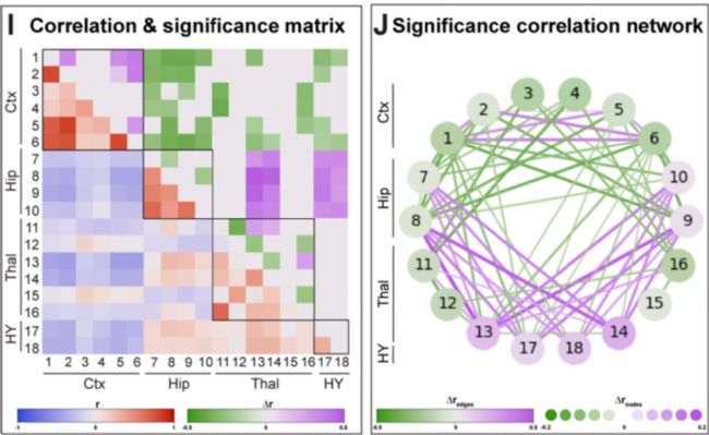 圖1. 清醒動(dòng)物中的藥理fUS方法和嗎啡的檢測(cè)結(jié)果。(I) ROI功能連接相關(guān)性/顯著性矩陣。方框標(biāo)注四個(gè)元區(qū)域(皮層、海馬、丘腦和下丘腦)。左下三角顯示(藍(lán)色-紅色)給藥后平均相關(guān)性矩陣,右上三角展示(綠色-紫色)顯著性差異的ROI對(duì)的功能連接改變量。(J) 顯著性相關(guān)圖展示矩陣中顯著變化部分:節(jié)點(diǎn)編碼各ROI的全局連接性,綠色-紫色邊表示相關(guān)性顯著變化的邊。