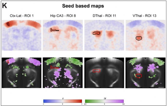圖1. 清醒動(dòng)物中的藥理fUS方法和嗎啡的檢測(cè)結(jié)果。(K) 幾個(gè)特征性腦區(qū)的seedmap分析圖。上行(藍(lán)色-紅色)代表給藥后各腦區(qū)平均的seedmap功能連接,下行(綠色-紫色)代表seedmap上有顯著性差異的位置的功能連接變化量。