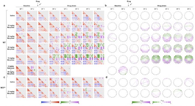 這些結(jié)果表明,在清醒小鼠大腦中,嗎啡顯著重塑了區(qū)域內(nèi)和區(qū)域間的功能連接模式,其主要特征為皮層與皮下結(jié)構(gòu)之間出現(xiàn)負(fù)相關(guān)。