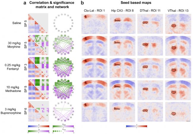 2. 功能連接指紋:由于fUS能供提供大量腦區(qū)的巨量信息,因此我們可以從“功能指紋”的角度理解這些信息。在這篇文章中,作者發(fā)現(xiàn)多種阿片類藥物引起的功能連接改變具有高度的一致性,這種共有的變化模式被作者稱為“阿片指紋”,進(jìn)一步的研究表明這種阿片指紋由MOP介導(dǎo),并與鎮(zhèn)痛效果高度相關(guān)。因此這種“指紋”可以作為一種關(guān)鍵性的biomarker,用于鎮(zhèn)痛藥物的開發(fā)與評(píng)估。