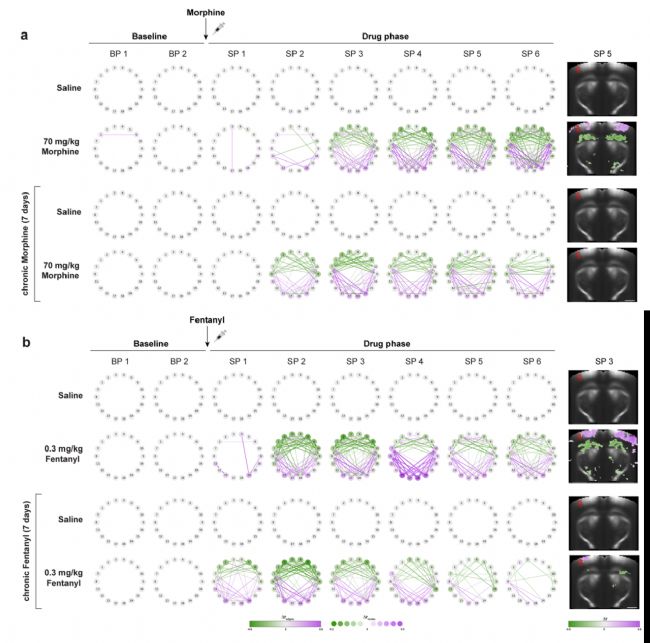 這些結(jié)果顯示,主要的阿片類藥物會(huì)引發(fā)一種高度一致的功能失連模式,作者稱之為“阿片指紋”(opioid fingerprint),藥物耐受的實(shí)驗(yàn)更強(qiáng)有力地支持了阿片類藥物誘導(dǎo)的、MOP特異性的功能連接指紋在功能上的重要性,也進(jìn)一步突顯其在響應(yīng)不同MOP作用配體中的意義。