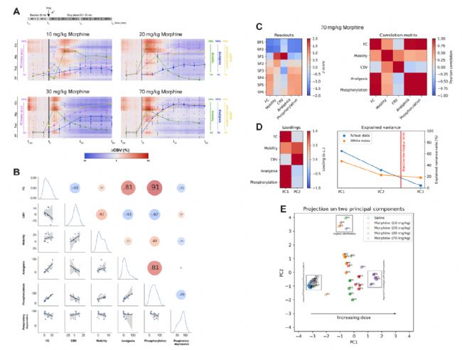 為驗(yàn)證這些觀察結(jié)果,作者對(duì)70 mg/kg 嗎啡實(shí)驗(yàn)中除呼吸抑制外的所有生理指標(biāo)進(jìn)行了PCA分析(圖6C-E)。結(jié)果顯示,僅兩個(gè)主成分即可解釋大部分變量變化:第一個(gè)主成分(PC1)與FC指數(shù)、鎮(zhèn)痛和MOP磷酸化高度相關(guān);第二個(gè)主成分(PC2)與運(yùn)動(dòng)和CBV最相關(guān)(圖5D)。這些實(shí)驗(yàn)結(jié)果表明:阿片類藥物引起的FC變化具有重要藥理學(xué)意義,因?yàn)樗鼈兪荕OP特異性的,體現(xiàn)了時(shí)間依賴性、劑量依賴性以及耐受性的發(fā)展。更重要的是,與局部灌注變化不同,FC的改變與鎮(zhèn)痛效應(yīng)這一臨床重要行為輸出高度相關(guān),而與呼吸抑制這一嚴(yán)重副作用無明顯相關(guān)。